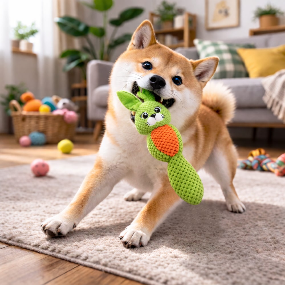 With an elongated shape that’s easy for dogs to grab and carry, Mr. Hops encourages natural play instincts while being gentle on teeth and gums. The cheerful bunny face and carrot-inspired belly add extra charm, making this toy just as cute as it is entertaining.