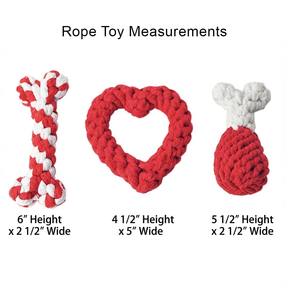 Includes 3 festive rope toys: heart, bone, and treat shapes