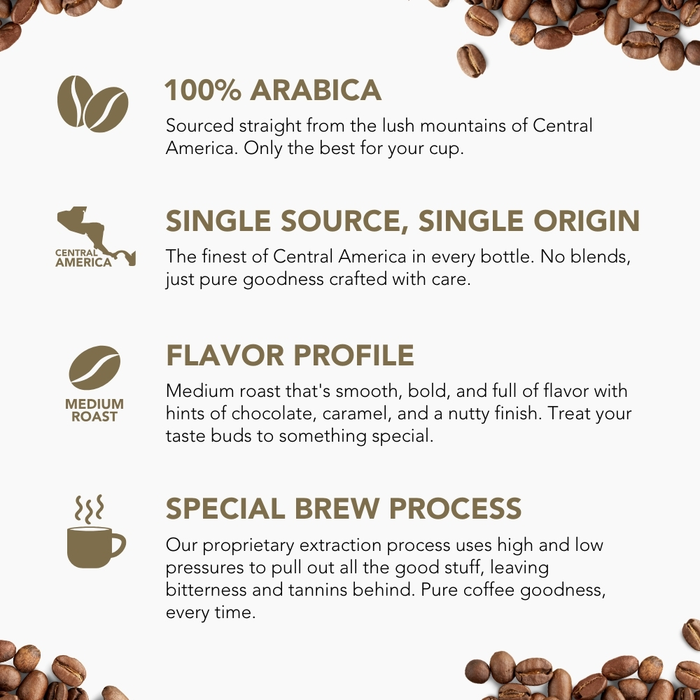 - QUALITY IN EVERY BOTTLE: Crafted from 100% Arabica beans sourced from Central America, our single-origin medium roast boasts flavors of chocolate, caramel, and nut, providing a smooth, bold taste experience.