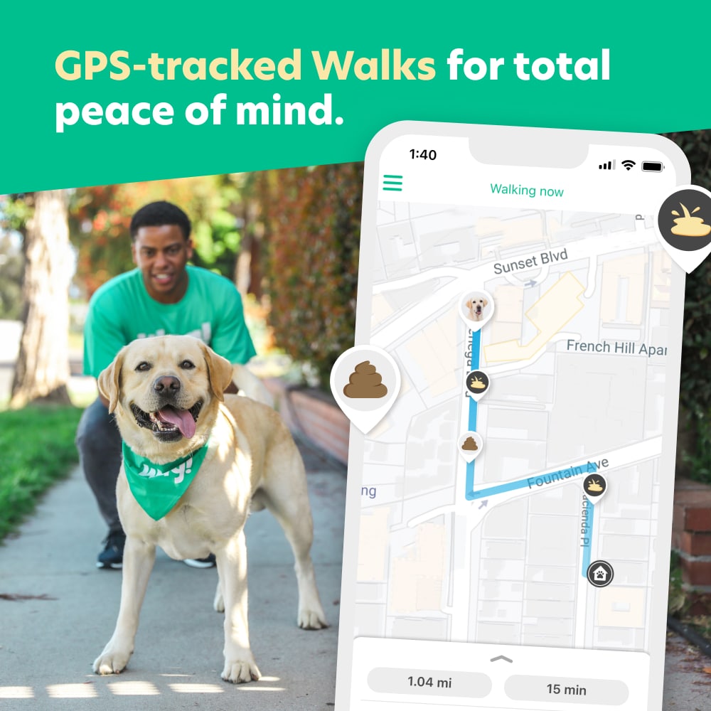 • Follow along in the app: Download the Wag! App to track walks via GPS, communicate with your Caregiver, and enjoy real-time photo and video updates.