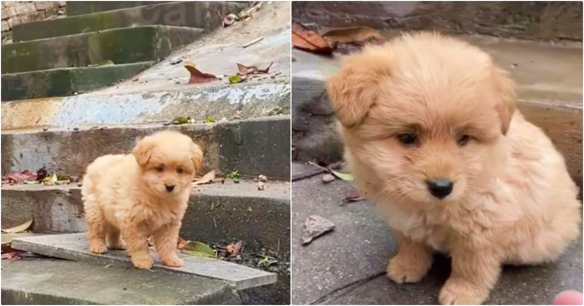 A woman spotted a helpless puppy on his own. He was bounding down a building’s steps to greet her. He was fluffy and clean, so the woman figured his mother was nearby or that he had accidentally been separated from his family. The woman put her hand out to pet the pup, and he delightfully wagged his tail. She placed some chicken on the ground, and he eagerly ate every last bite. It was obvious he had not had a meal in a while. The woman’s heart broke for him. She knew she had to help.