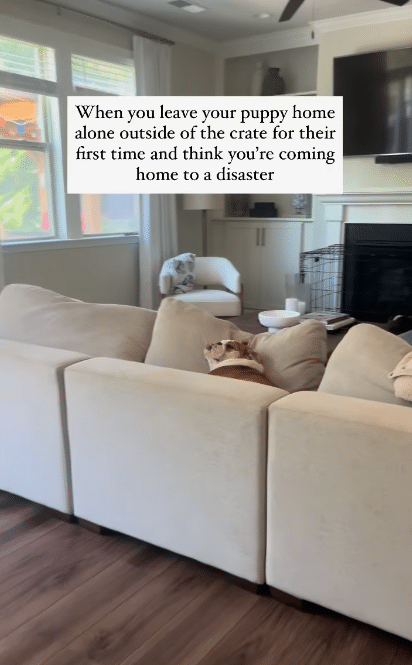 But what they found instead melted hearts everywhere. Daisy wasn’t tearing up the furniture or chewing on shoes. She wasn’t howling or scratching at the door. She was asleep—curled up peacefully between the couch cushions like she hadn’t a care in the world. The follow-up caption summed it up perfectly: “Daisy’s first time home alone outside of the crate for over an hour and this is what we come home to … A sweet sleepy princess.”