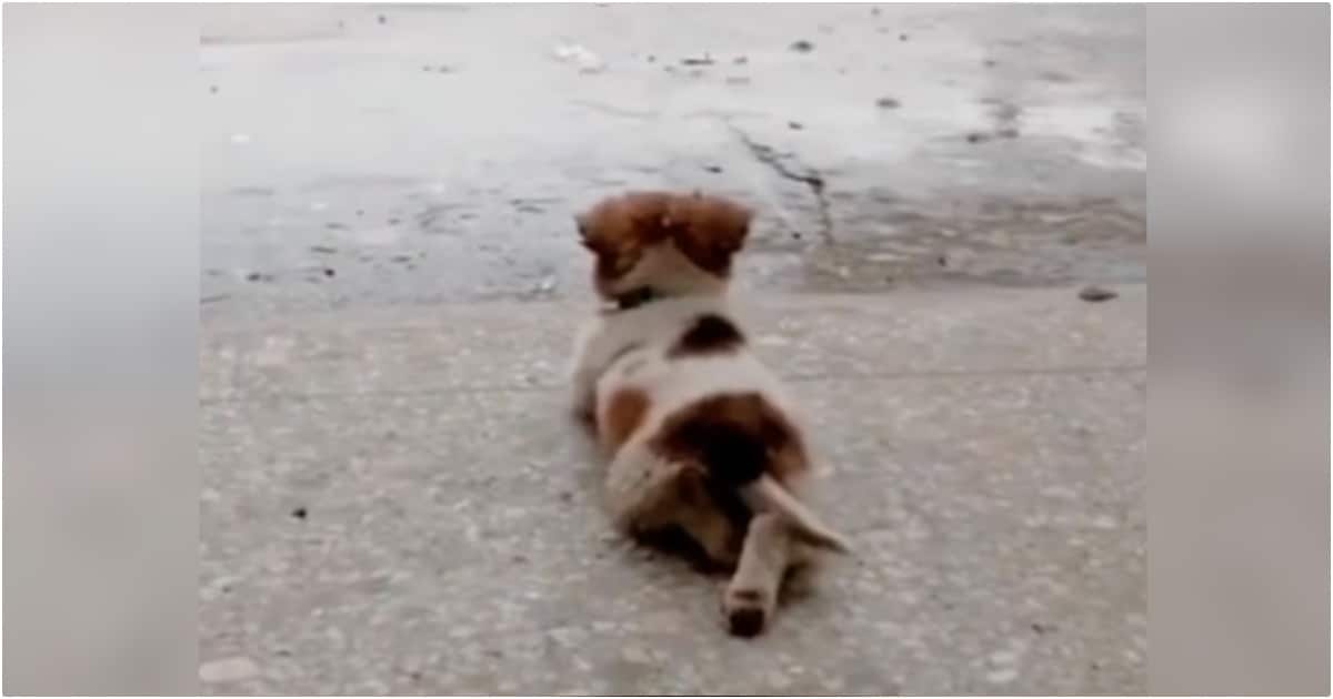 As his human stands from a safe distance filming, the puppy lies down on his tummy. He sploots and crosses his back legs in the cutest fashion. His little head moves about, fixated on the drops of water pummeling down; the sound is a symphony to his doggy ears.