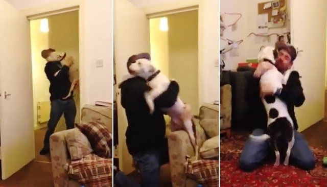 In the video below, you will see a dog welcoming his human home. This Staffordshire terrier named Patch was adopted by his humans from the Scottish SPCA last year. Ever since then Patch has been very close to his new daddy, Mark. Mark went away for a week, and now he’s come home. Watch just how happy Patch is when his daddy gets home!