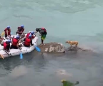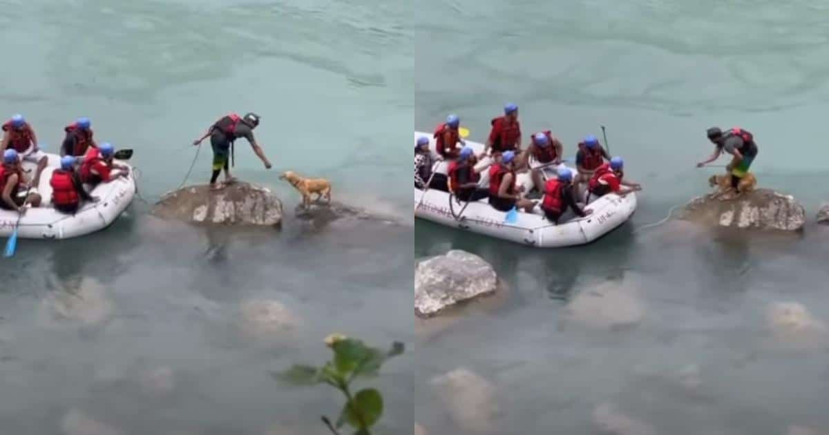 As the Ganga surged with rising waters, a small and helpless figure stood alone against the current. A stray dog found itself stranded on a narrow rock, surrounded by fast-moving water that left no path to safety. With each passing moment, the danger grew more intense, and the dog remained trapped, unsure of where to turn. What could have easily ended in tragedy became something far more powerful, as a group of strangers noticed the animal’s silent struggle and chose to act with courage and compassion.