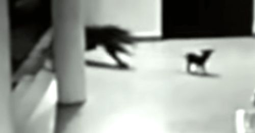 The security footage shows the small puppy standing on her own outside of the building, completely unaware of the approaching danger. As the puppy begins to walk along the porch, you soon see a large leopard creeping into the shot.