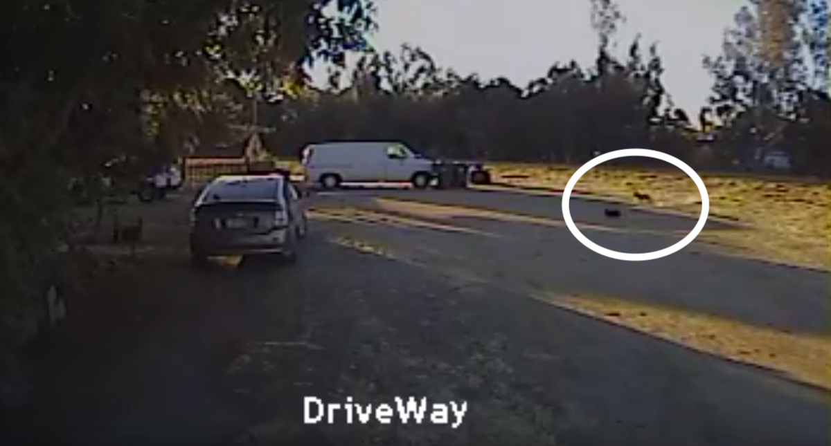 The coyote comes running in from the right side of the screen and grabs the little dog trying to run off with it. Thankfully, Trixxie’s on a leash. This allows time for the neighbor’s Rottweiler to realize what’s going on and come to the rescue. The heroic dog chases the coyote away saving the tiny dog’s life. Trixxie didn’t suffer any serious injuries, and the coyote hasn’t been back. But the family will take extra precautions in the future just to be sure.