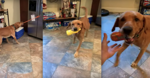 This dog’s dad starts off by placing two slices of bread on a plate. Then, he turns to his furry friend to help him complete his sandwich. While the dad sits at the table, he calls out different ingredients for his dog to bring. There is a rope attached to the fridge’s handle, so the dog is able to pull the door open with ease.
