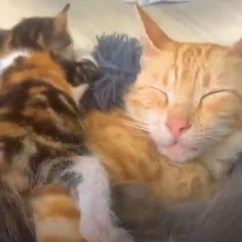 Even though Annie couldn’t produce milk, she found other ways to care for her adopted babies. She would carry them gently to Charli for bottle feedings and never let them out of her sight. When the kittens were old enough to explore outside, Annie sat nearby, watching closely to make sure they were safe.