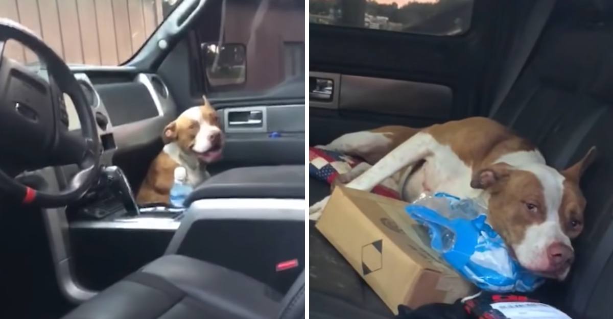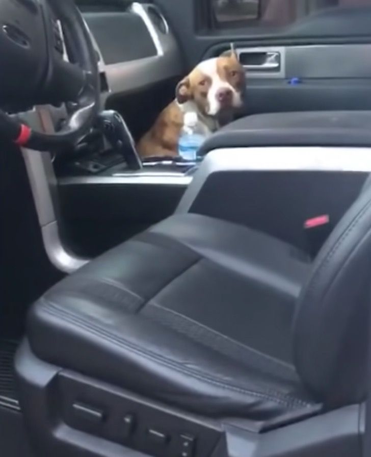 This kind-hearted pit bull, upon seeing the empty truck and assuming it was somebody’s ride, wasted no time entering in search of a home. He felt safe inside the truck and made himself at ease until he found his forever family.