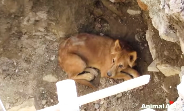 In India, a dog has fallen into a pit in the ground at a construction site. The pit was too deep for him to come out on his own, and it looks like he may have hurt himself from the fall. Animal Aid Unlimited quickly went to the site to rescue the poor dog. Watch the rescue in the video below!