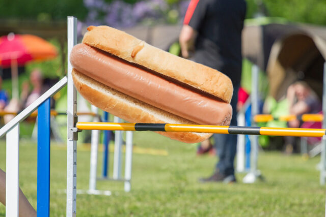 For others, it’s less about the dress and more about sports. Hot dogs have long been a staple at sporting events, but never as the main attraction. In hot dog agility, all eyes are on the frankfurters as they go through complicated courses. Wiener handler Matt Warwas tells iHeartDogs that it’s less about speed and more about accuracy.