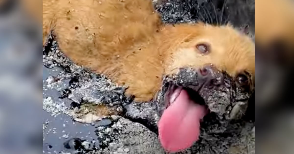 Homeless animals face unthinkable challenges and hardships. Not only do they have to worry about finding food and shelter, but they also have to be on the lookout for potential dangers. One puppy, struggling to survive, found herself stuck in a precarious situation while on a quest for food. The weather was unusually hot–115 degrees– and tar that was being used for repairs had melted in her path. The poor soul became stuck in the road with no way of saving herself. She was clever enough to call out and cry loudly enough to be heard by a passerby, who alerted rescuers.