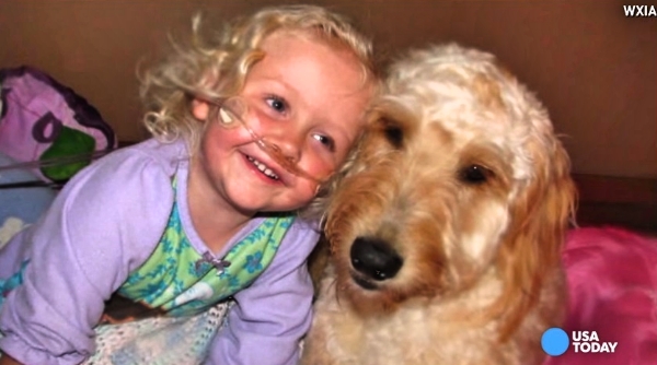 Meet Alida and her service dog Mr. Gibbs. Alida was diagnosed with a disease that prevented the oxygen in her lungs from getting to her bloodstream. Alida has to drag around an oxygen canister with her dad’s homemade cart. But when Alida goes outside, Mr. Gibbs helps her by carrying the oxygen for her. Watch the video below for the full story!