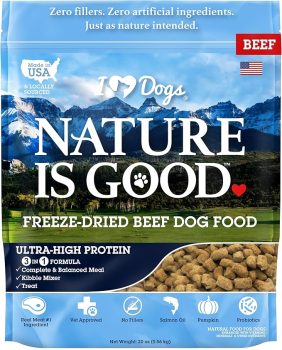 Nature is Good is one of the newer brands on this list, but they’ve built an impressive foundation fast. Their freeze-dried raw food is veterinarian-approved, completely filler-free, and very high in protein. No recall on any product since they launched.