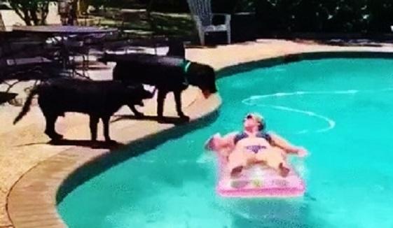 So when this woman was relaxing and floating in the pool, she was totally surprised by what her dogs did. In the video below, you can see her floating in the pool with her dogs watching her on the side of the pool; and it looks like these dogs really want to dive in! One of them even has a shark fin on his back! Watch the video clip below and see what one of her dogs did that caught her completely off-guard!