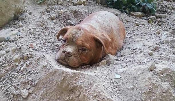 Somebody deliberately buried her and left her there for dead. Her leash was even tied to a sack of gravel to prevent her from freeing herself.