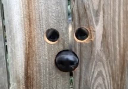 Jennifer Bowman shared this video to Facebook with the caption, “Got tired of the neighbors German shepherd jumping to peek over the fence so I made her a peeking spot. I think she likes it.” There’s two holes for the pup’s big brown eyes, and a larger hole that is the perfect size for her cute wet nose to poke through!